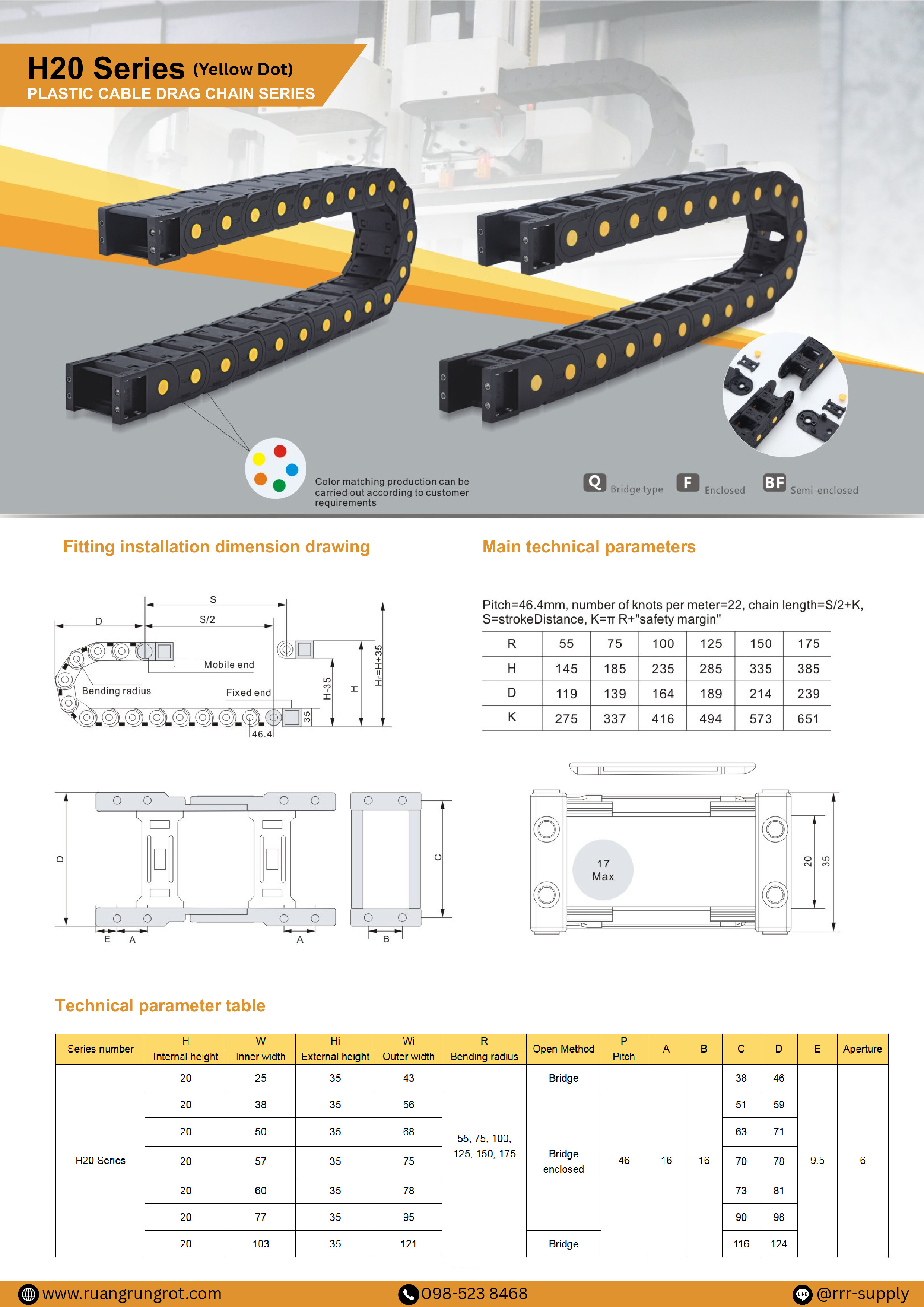 หมวดหมู่สินค้า : H20 Seriesรหัส : DW-H2025-R75รางกระดูกงูพลาสติก สำหรับร้อยสายไฟในเครื่องจักร หรือใช้เก็บสายไฟให้อยู่เรียบร้อยภายในราง เมื่อมีการเคลื่อนที่สายไฟและรางจะเคลื่อนตาม ทำให้สายไม่สะดุดห